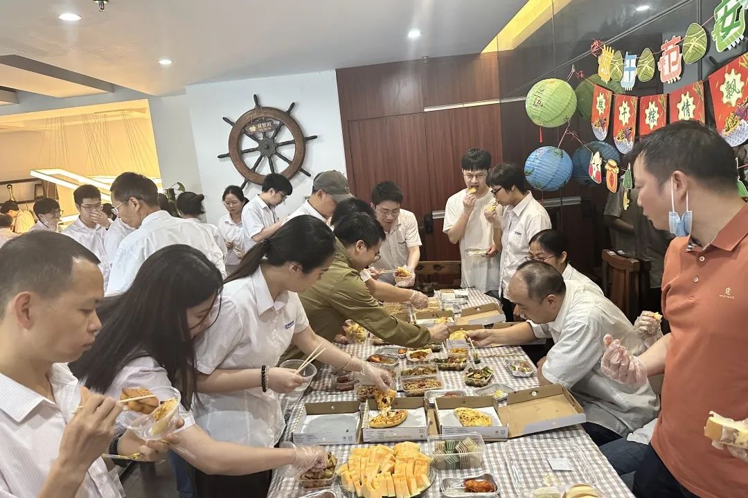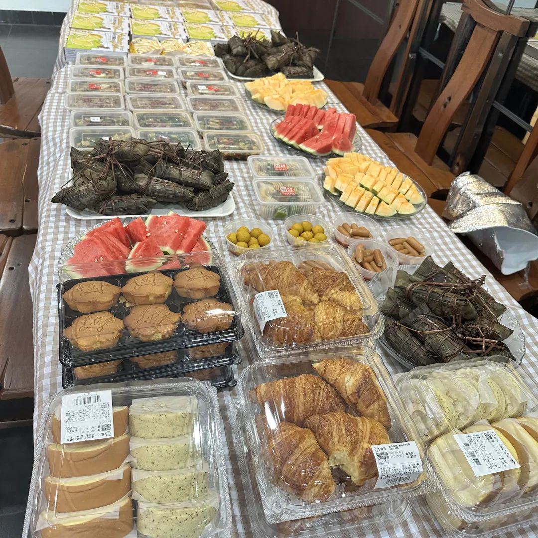 天安办公室变身美食的天堂,一场热闹非凡的大食会开启!这里有软糯香甜的粽子,还有丰富的主食、新鲜的水果、香脆酥嫩的鸡翅、美味的糖水等,每一样都让人垂涎欲滴。